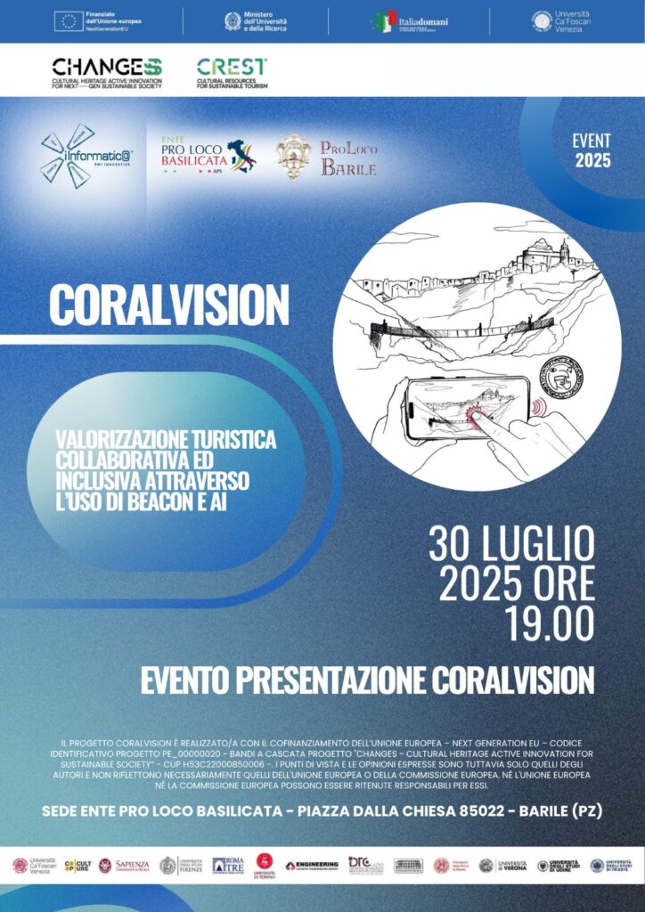 Dopo la presentazione del progetto al CTE Matera il 9 luglio e al Sud Innovation Summit il 23 luglio a Potenza prosegue nel territorio lucano il tour di disseminazione scientifica dei risultati della ricerca industriale del progetto Coralvision, progetto della iInformatica Srl cofinanziato dal MUR tramite il bando a cascata CREST del partenariato CHANGES coordinato dall’Università Ca’ Foscari di Venezia, che mira ad una valorizzazione territoriale accessibile tramite beacon e intelligenza artificiale seguendo l’approccio HITL (Human in The Loop). Il progetto sarà presentato alle ore 19 di mercoledì 30 luglio all’interno della serata “Innovazione sostenibile made in Basilicata” organizzata dall’Ente Pro Loco Basilicata. In merito all’evento il Presidente regionale Ente Pro Loco Basilicata Aps e Presidente Pro Loco Barile Rocco Franciosa afferma “si tratta di un momento di grande prestigio in cui verrà affrontato il tema del ruolo dei volontari delle Pro Loco, quale perno di una promozione attiva del territorio, in linea con gli obiettivi della Convenzione di Faro. A tal proposito verrà configurato il primo beacon del progetto simbolicamente installato nella sede dell’Ente Pro Loco Basilicata”.